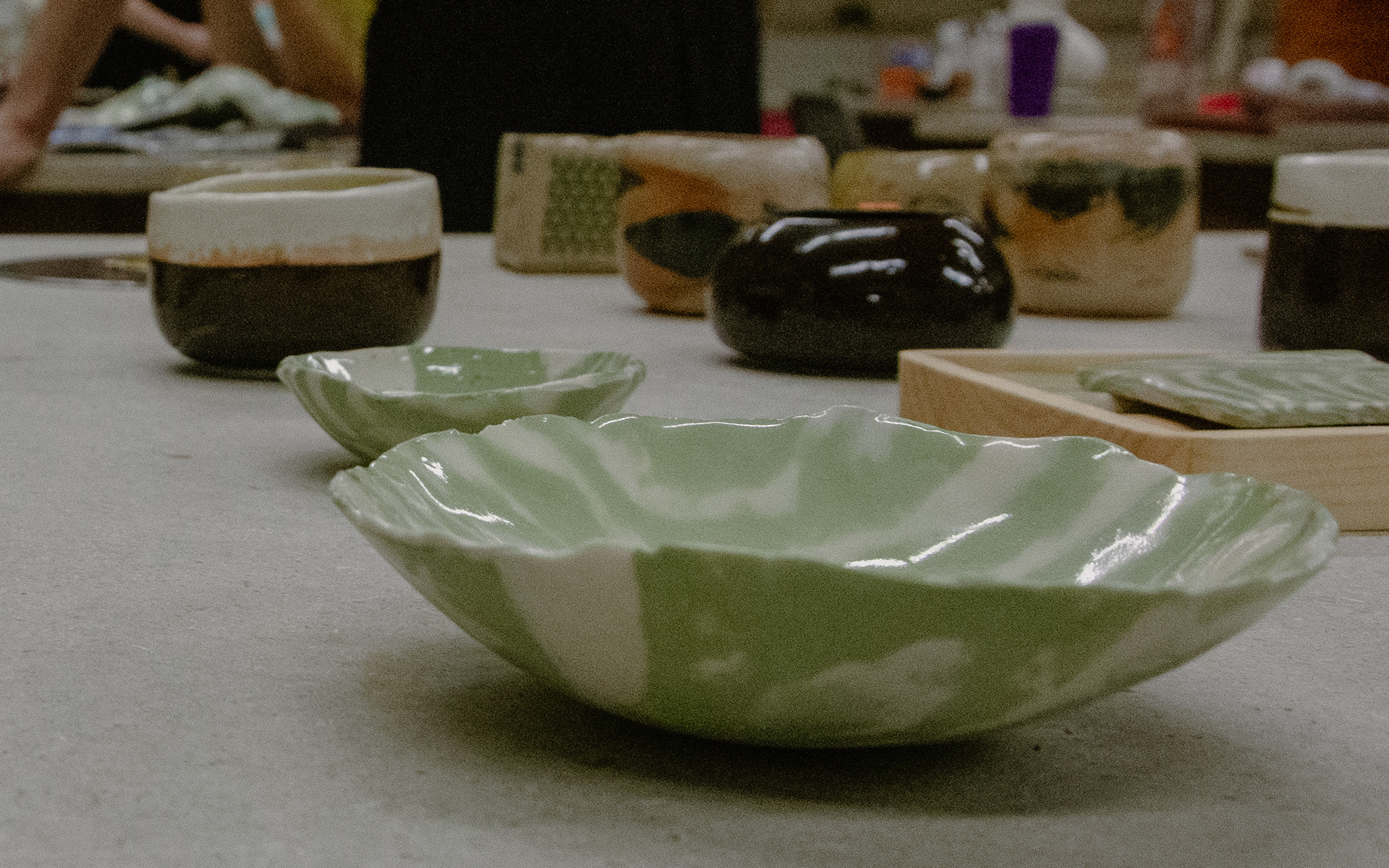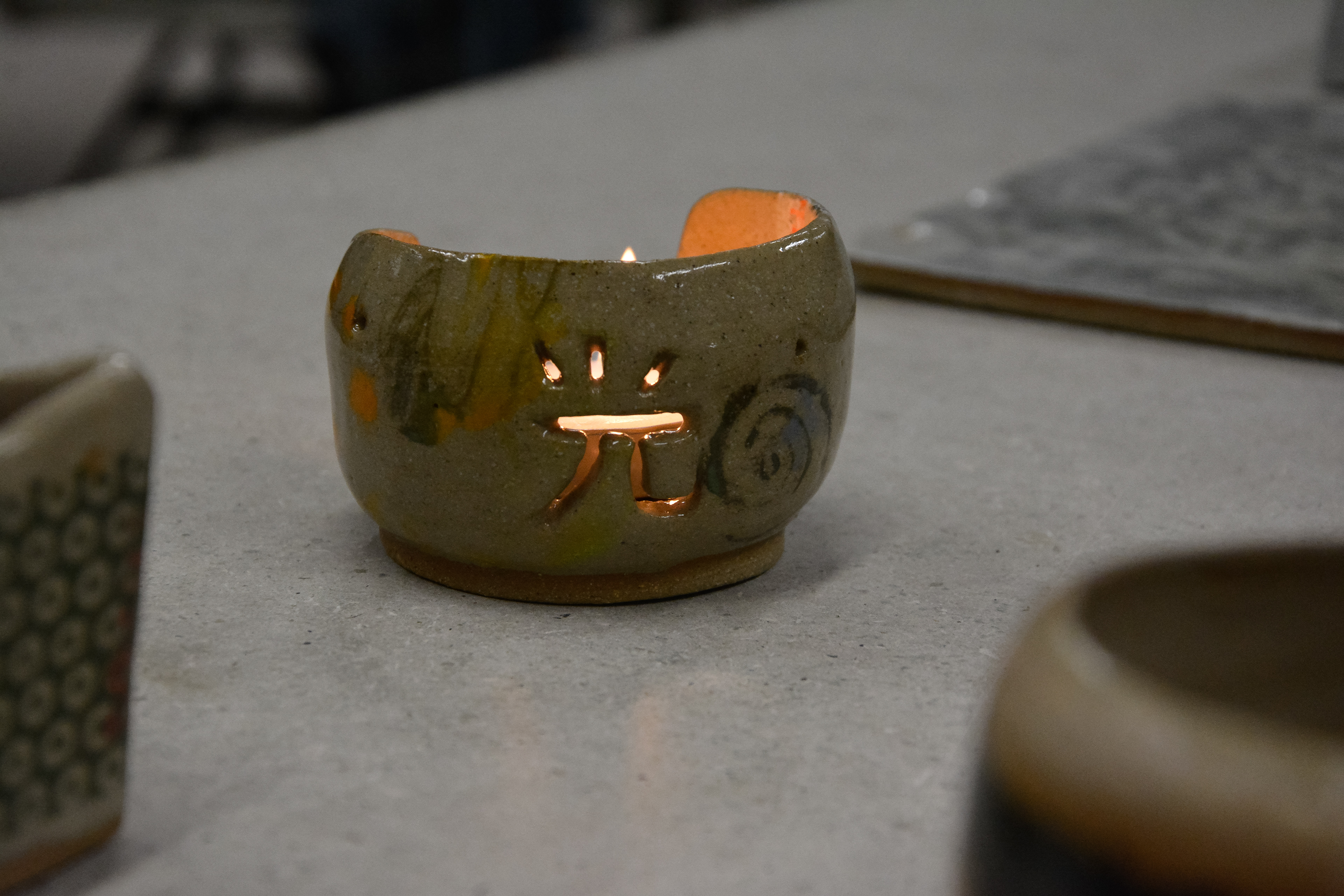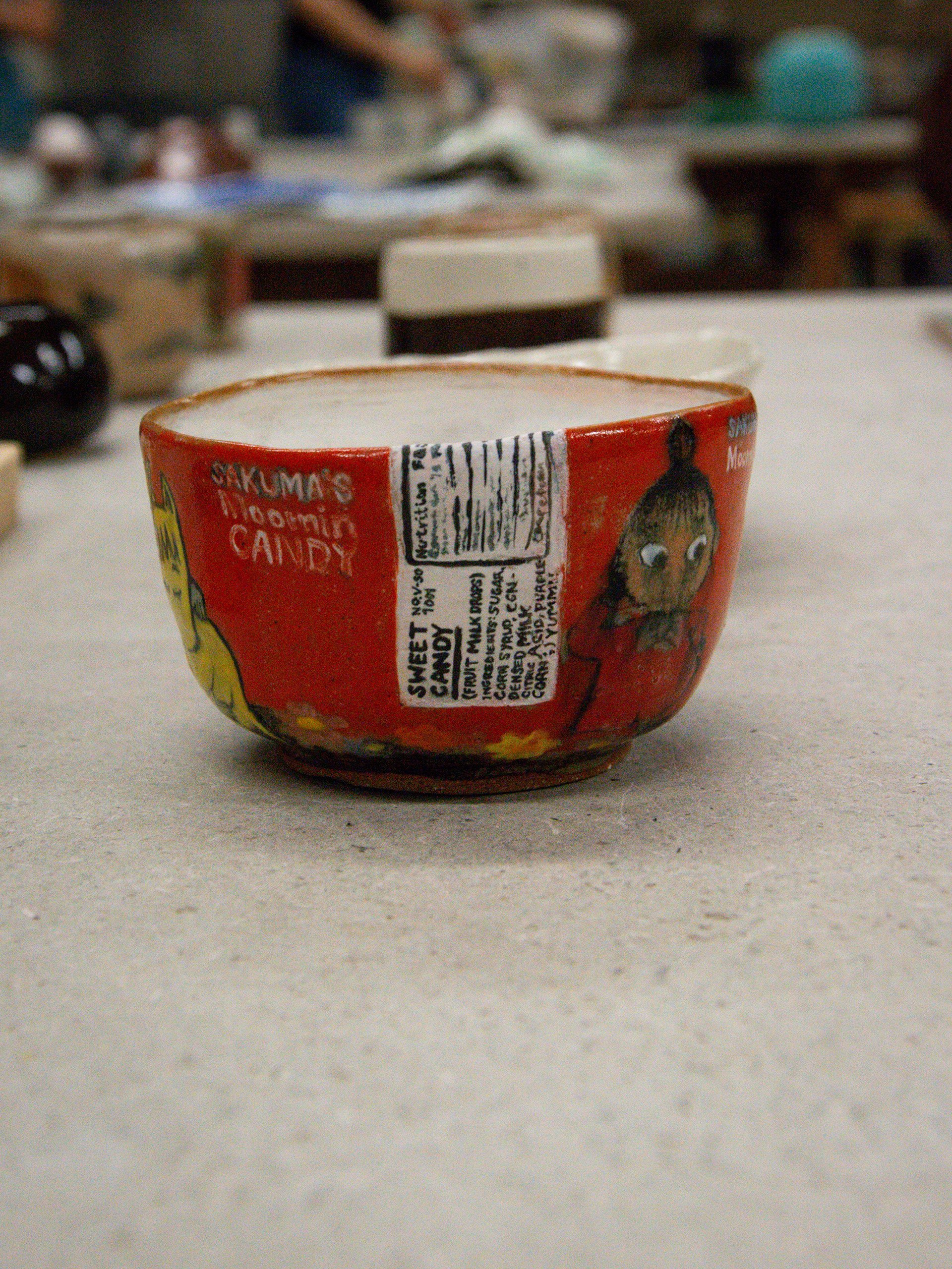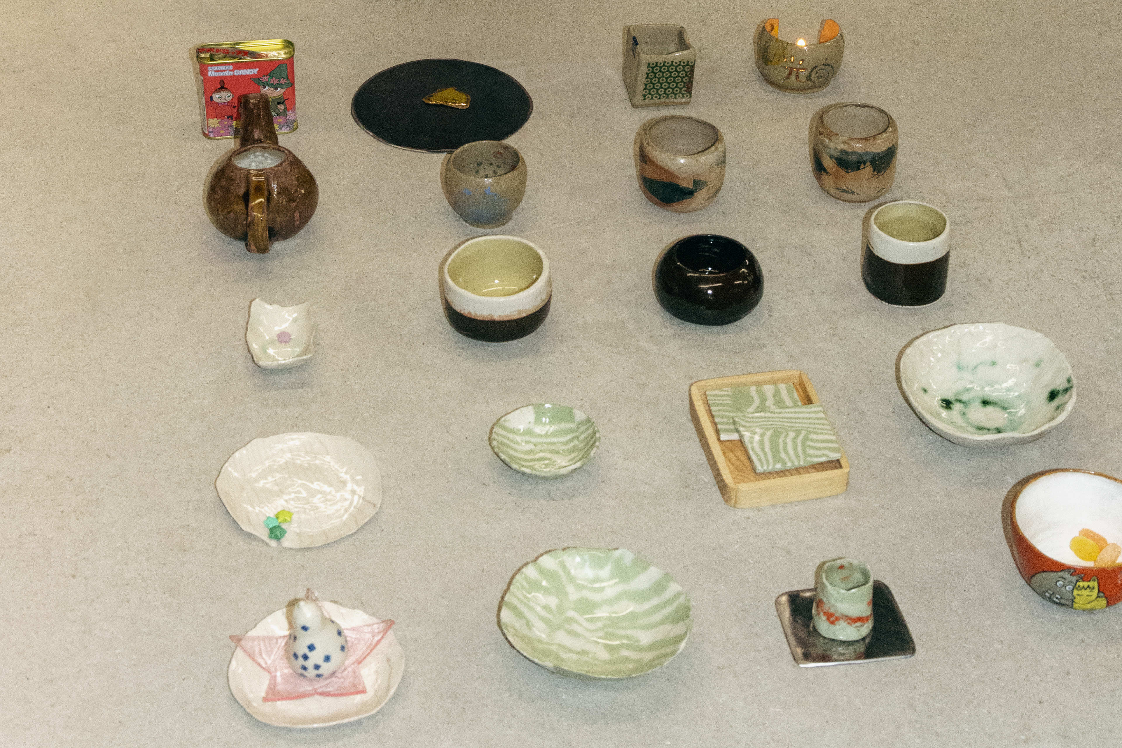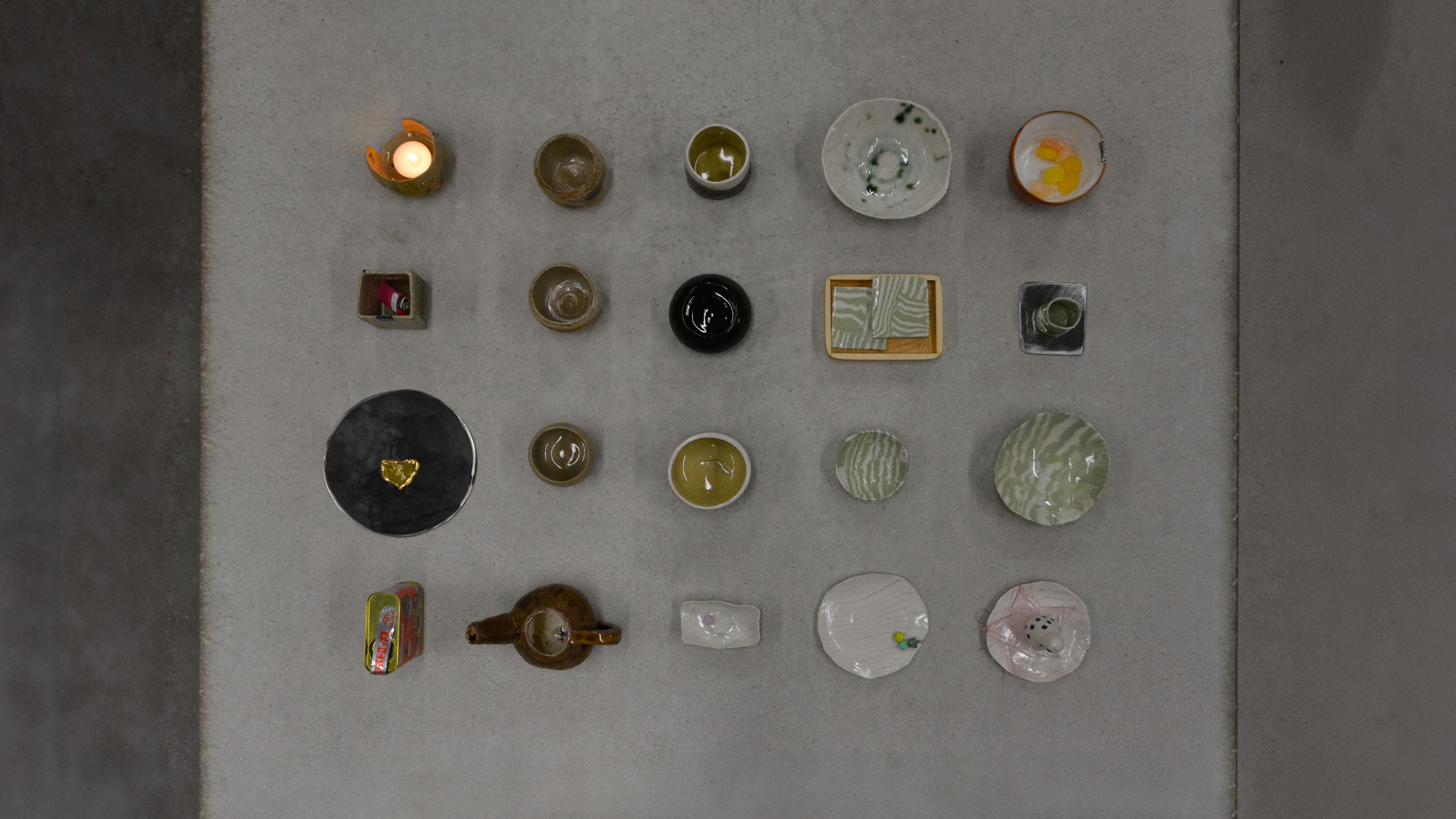 (2024) glazed stoneware and porcelain objects, steel, resin, wood, glue,. paper, candy and candy box